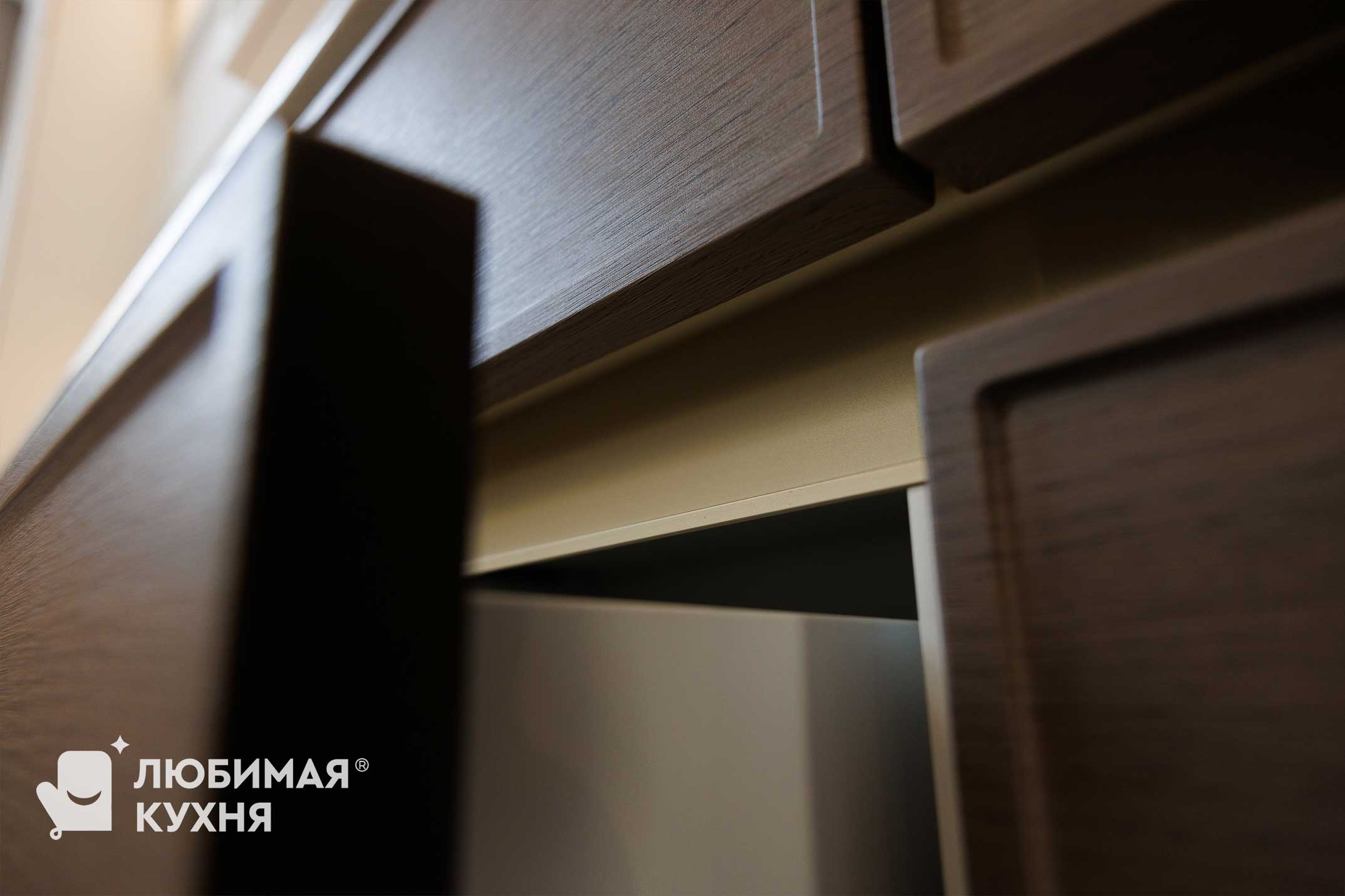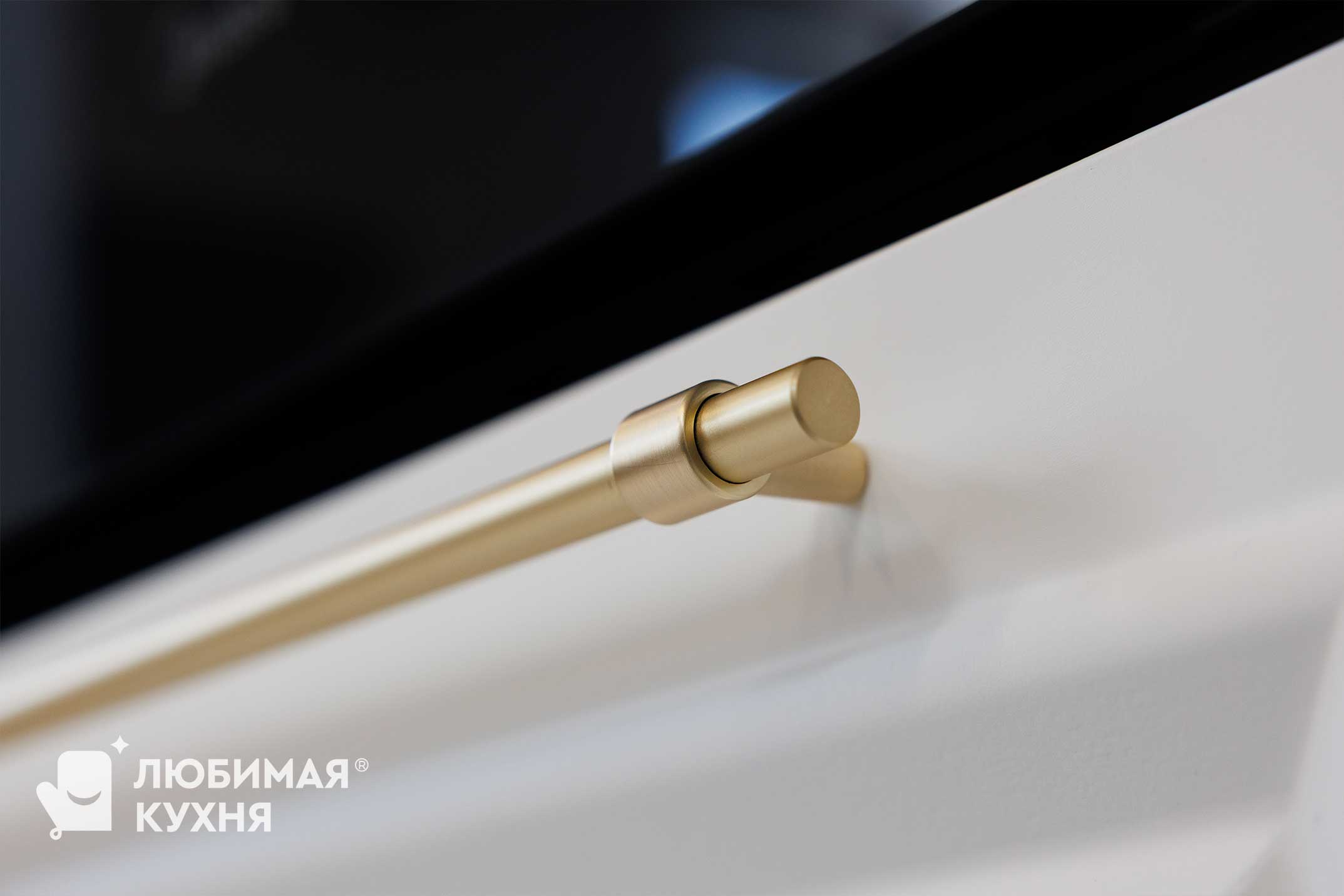 Светлые фасады с классической фрезеровкой, доходящими до потолка, визуально увеличивают высоту помещения и создают ощущение цельного архитектурного объёма. Витринные вставки с подсветкой добавляют лёгкости и декоративности. Карниз и вертикальные панели подчёркивают классический характер композиции.