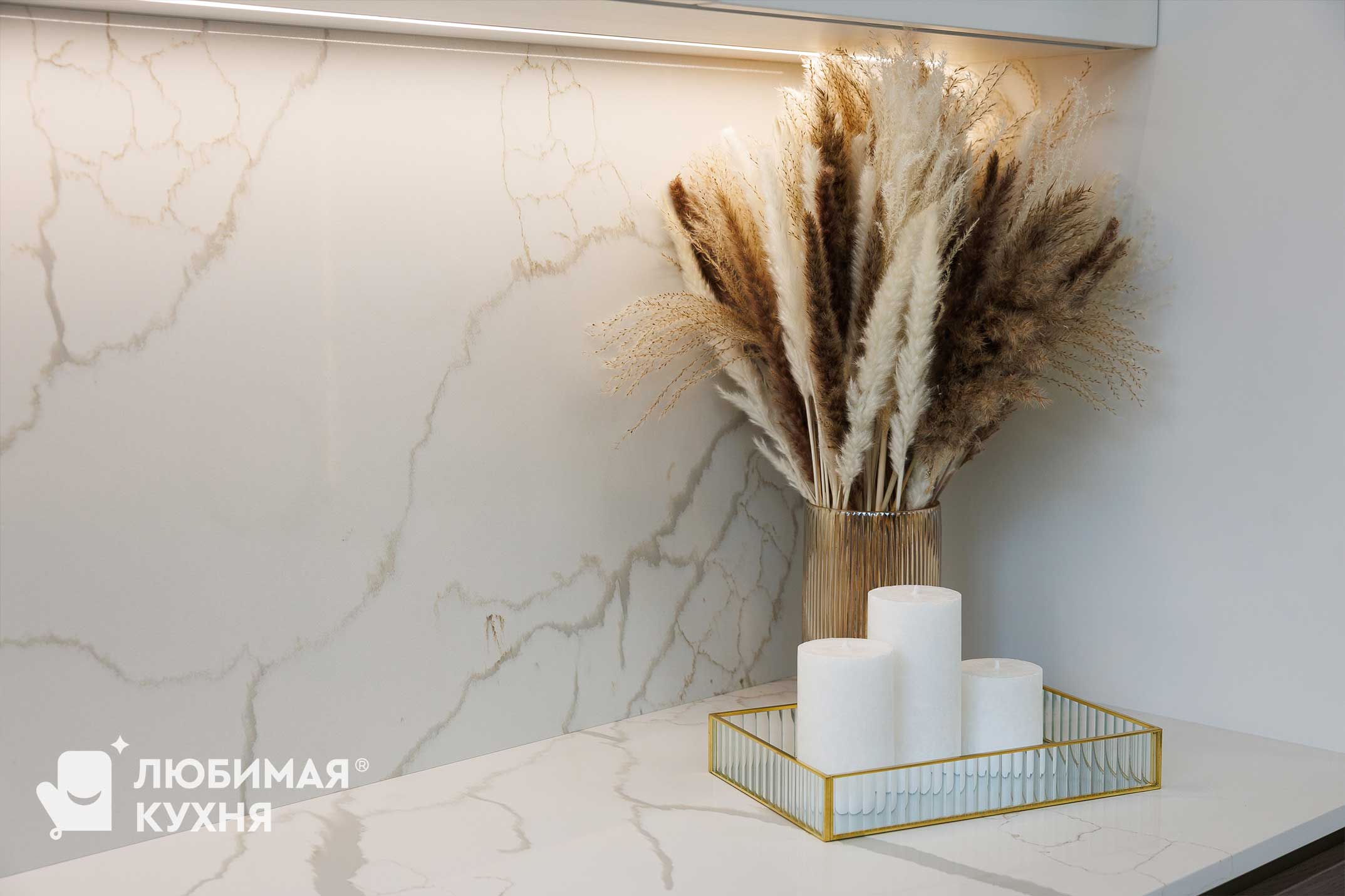 Эта кухня выполнена в элегантном современно-классическом стиле с акцентом на свет, пропорции и благородные материалы.