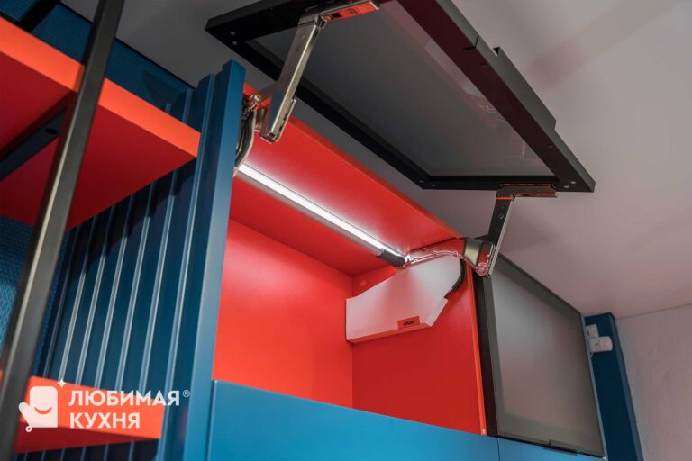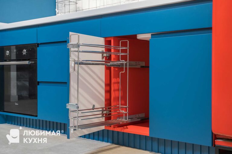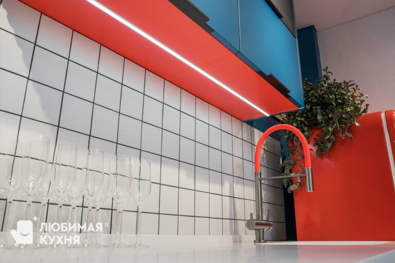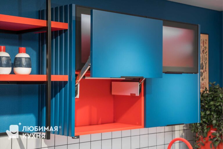 Яркая, стильная кухня — выбор для самых смелых! Фасады цвета индиго с красным корпусом и холодильником — создают невероятное сочетание. Для тех, кто не боится добавить в свои будни яркости и уж точно не быть как все!