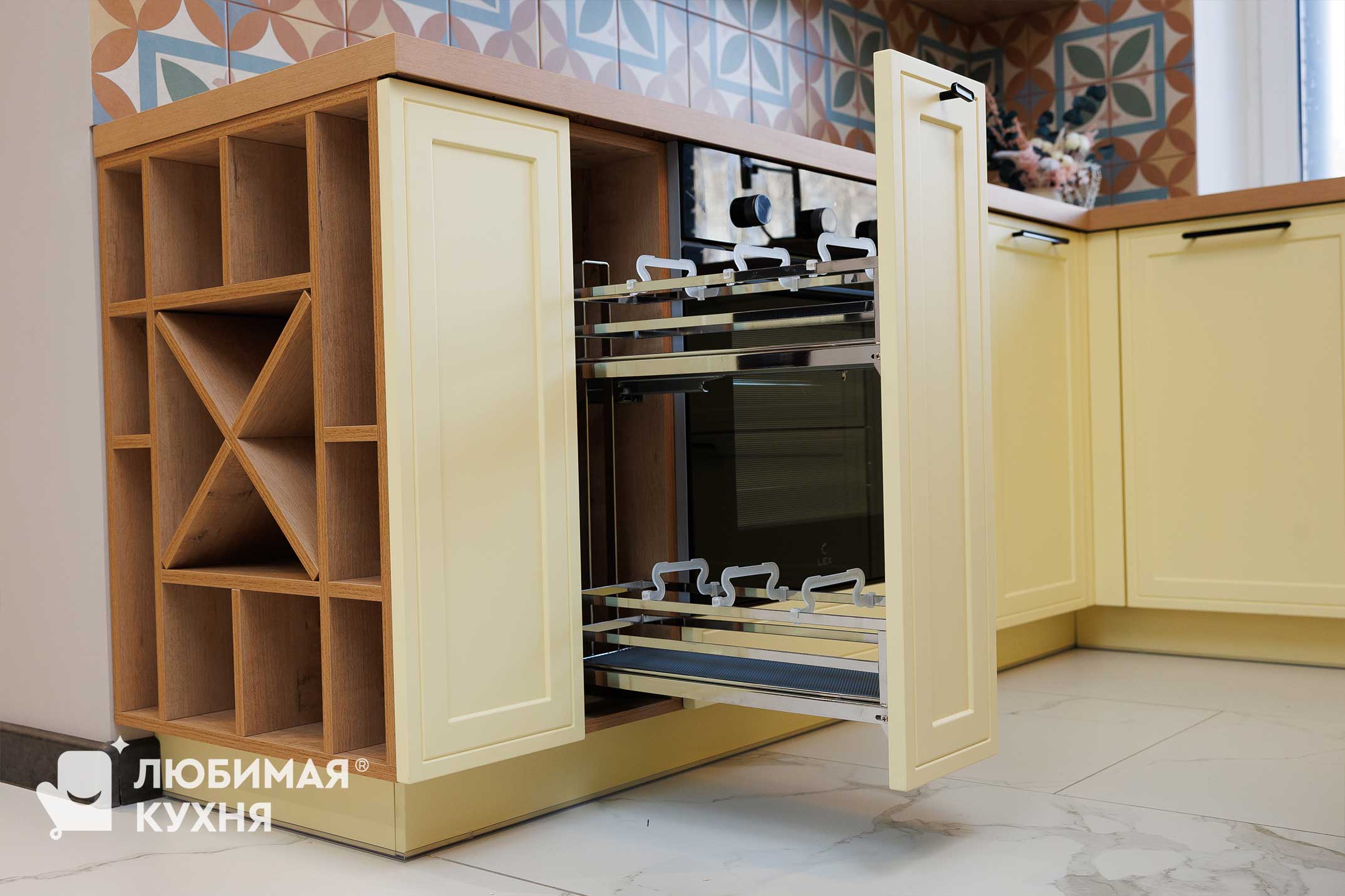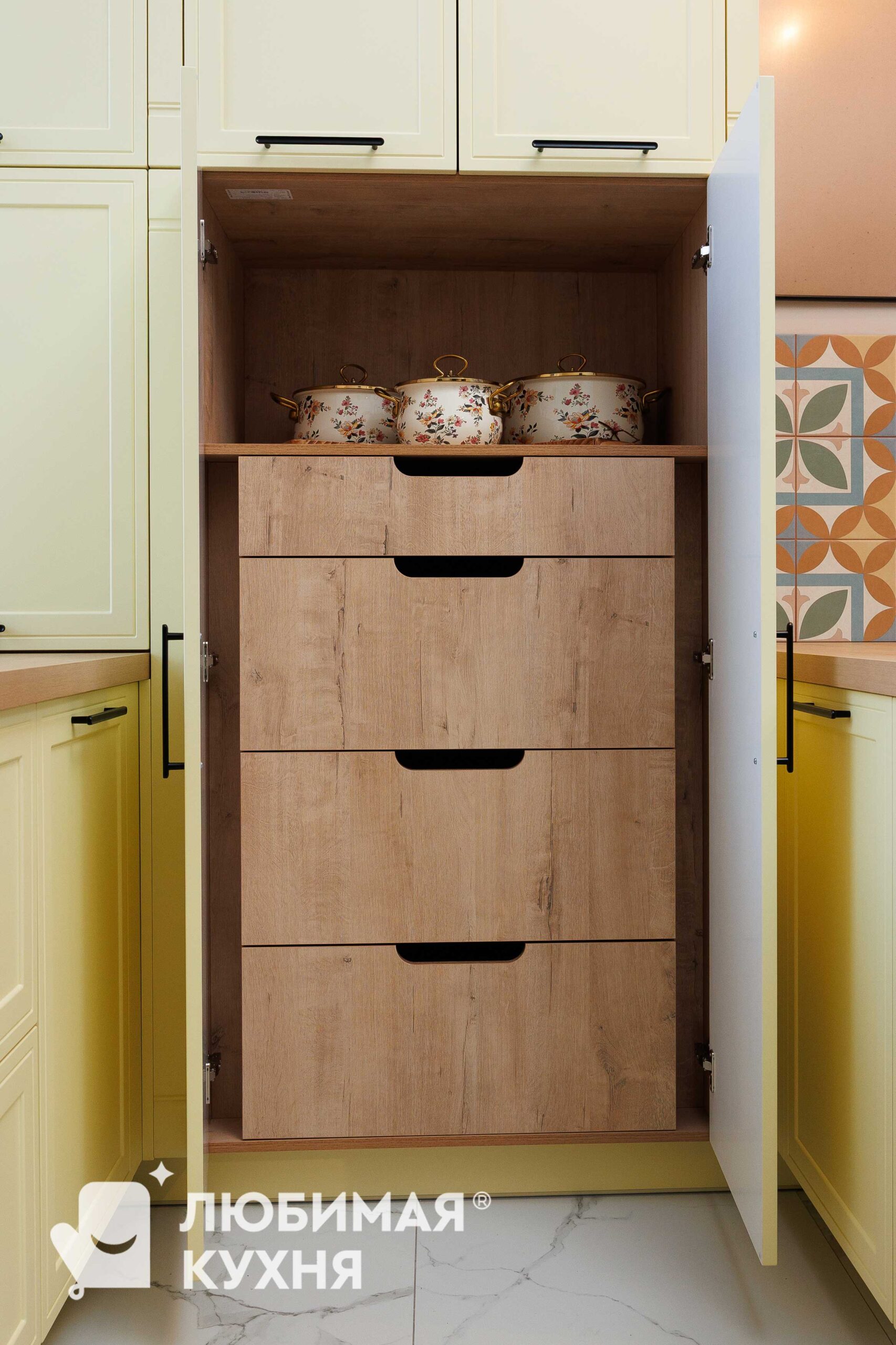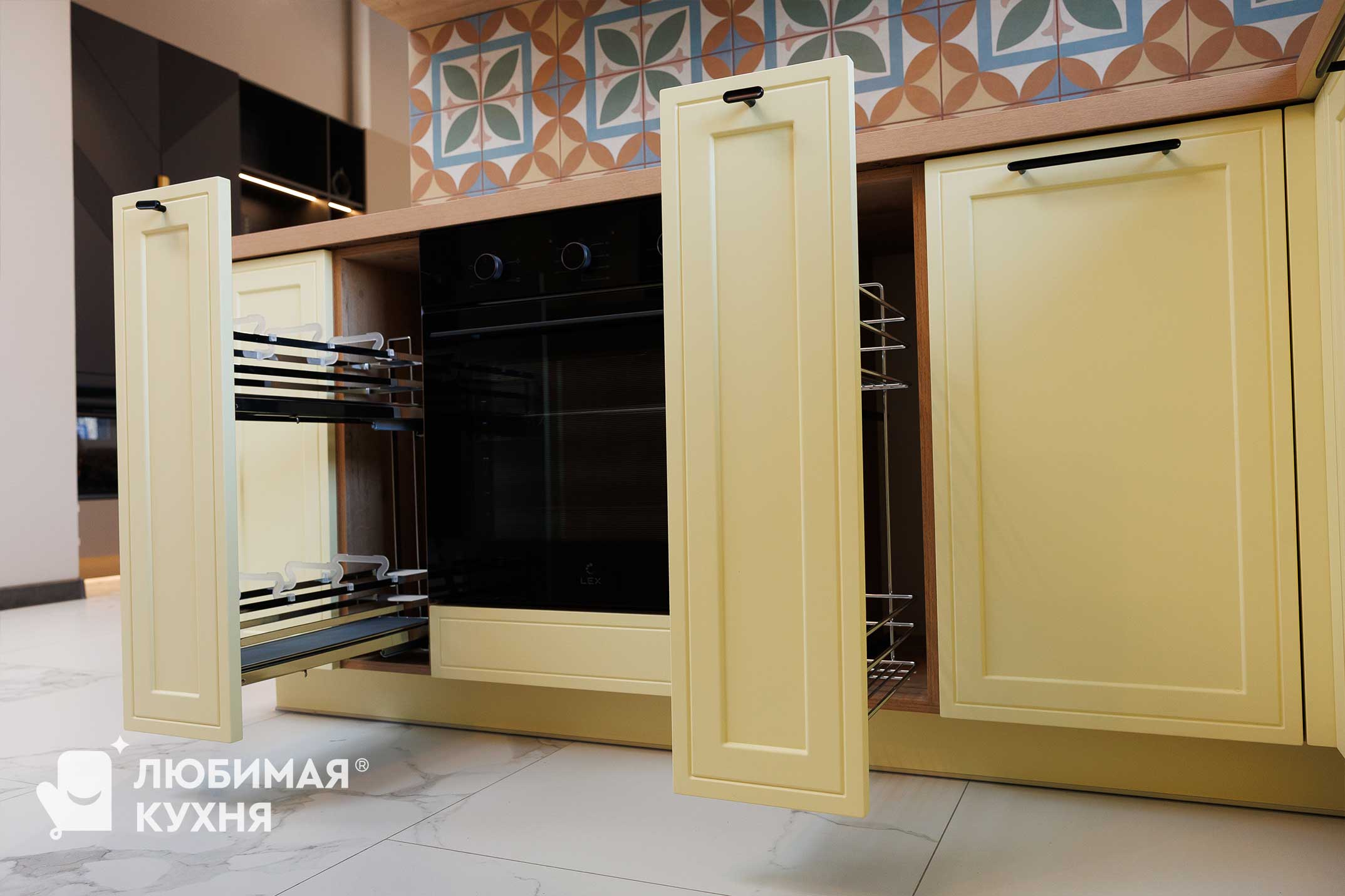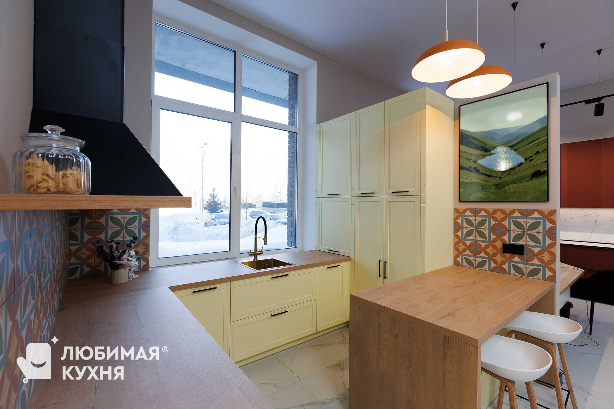 Уютная кухня в скандинавском стиле с фасадами нежно-лимонного оттенка. Фартук из цементной плитки с геометрическим орнаментом в терракотовых и оливковых тонах добавляет характер пространству. Функциональный остров из ЛДСП с текстурой дуба со встроенной розеткой служит обеденной зоной. Очень милая кухня, которая прекрасно впишется в интерьер квартиры и загородного дома.