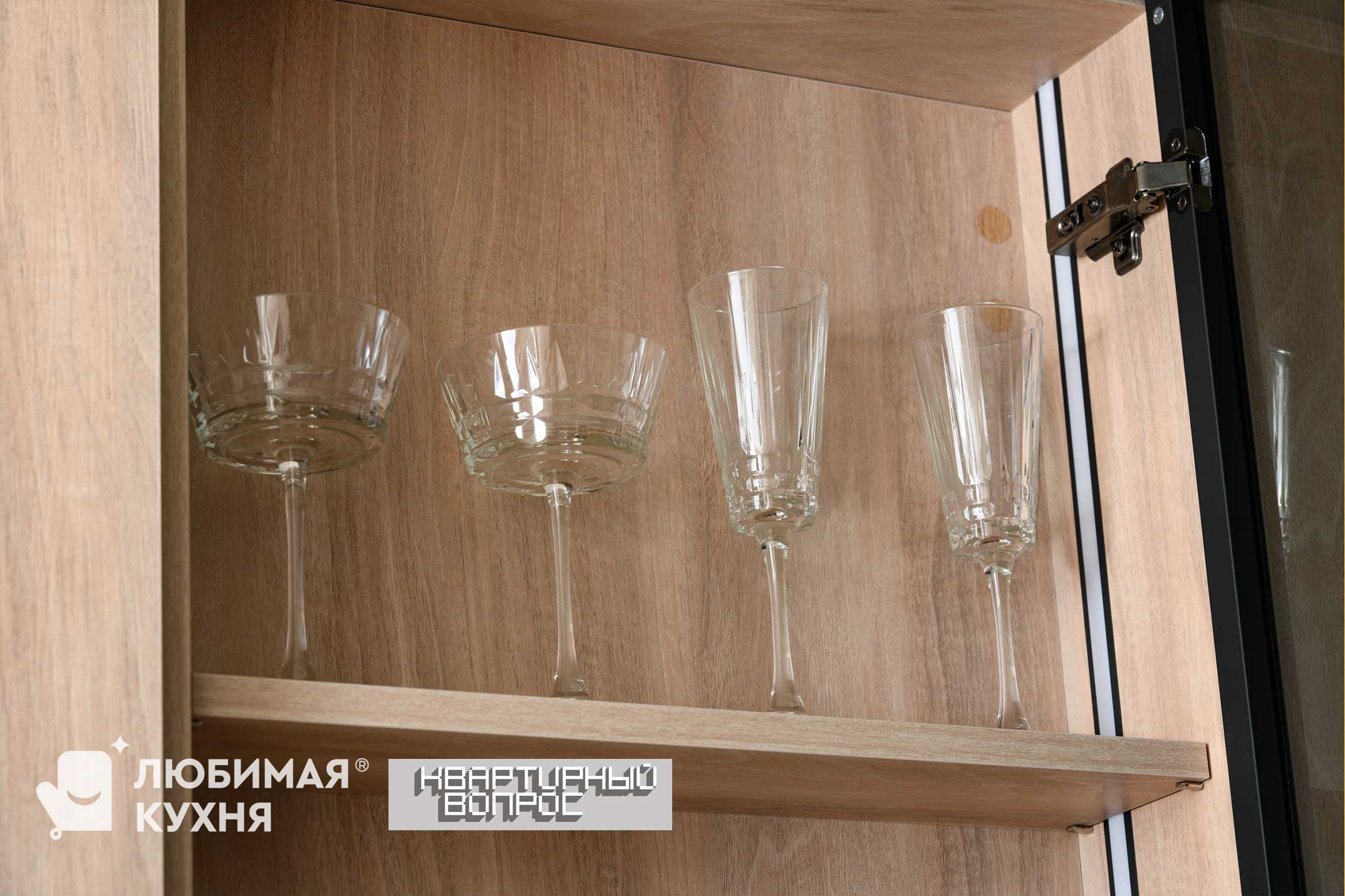Часть нижних баз на кухне глубиной 40 см. Это позволит сэкономить пространство и уместить всю технику. Корпуса элементов – из ламинированной ДСП с пластиковой кромкой. Она надежно защищает от повреждений. Для тумб в качестве ручек используем удобный профиль Gola. Ящики гарнитура –полного выдвижения, с доводчиками. Распашные дверцы – с петлями легкого монтажа.