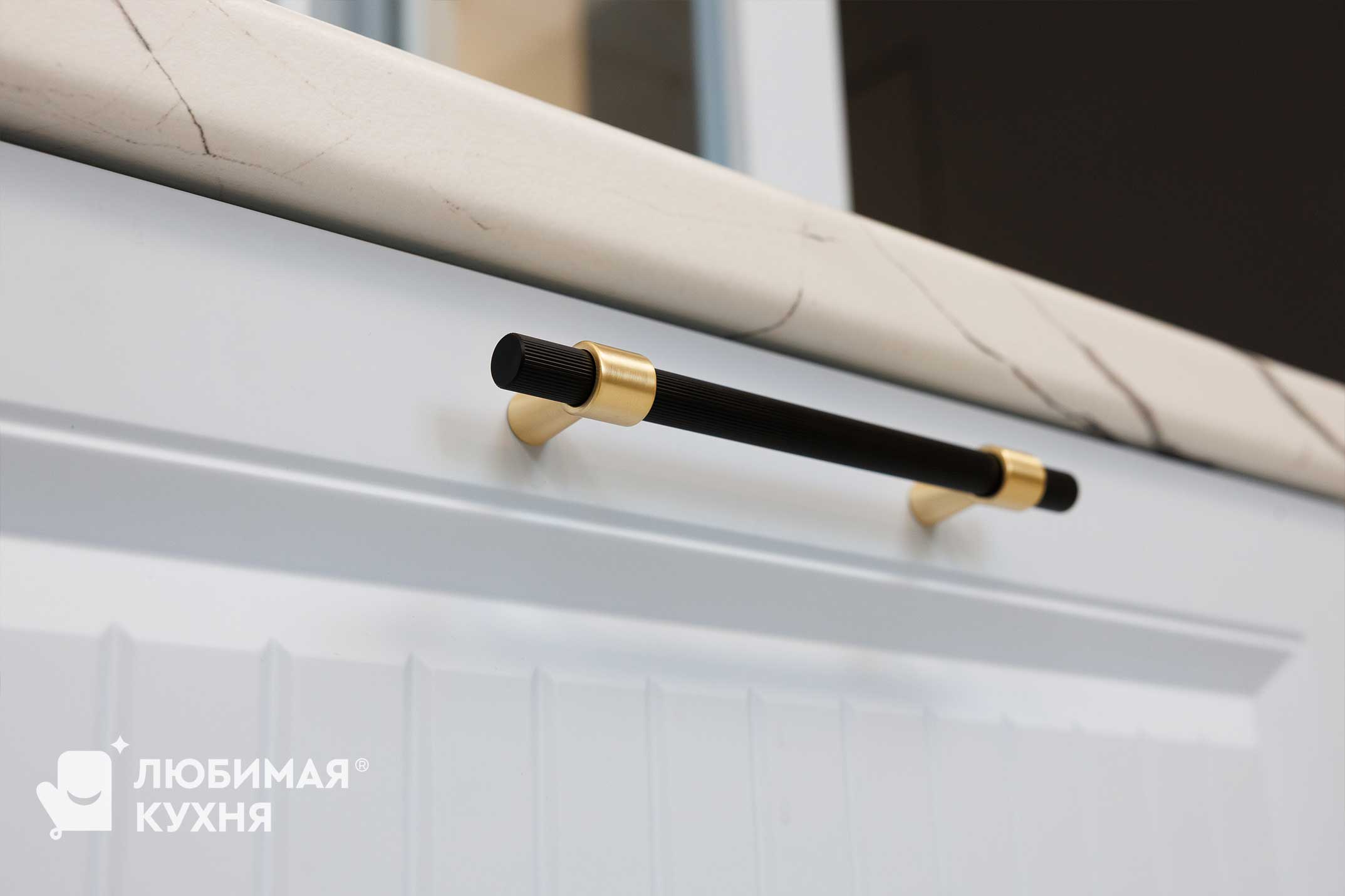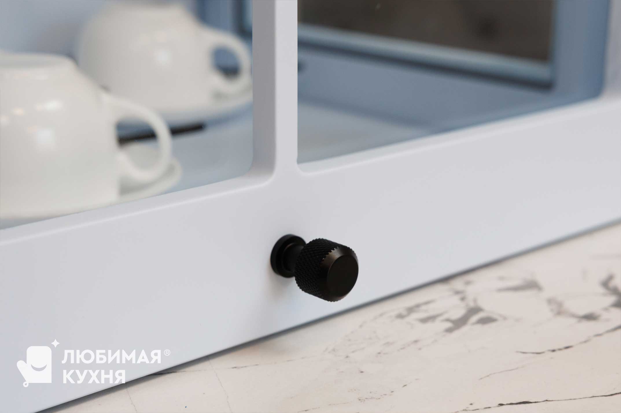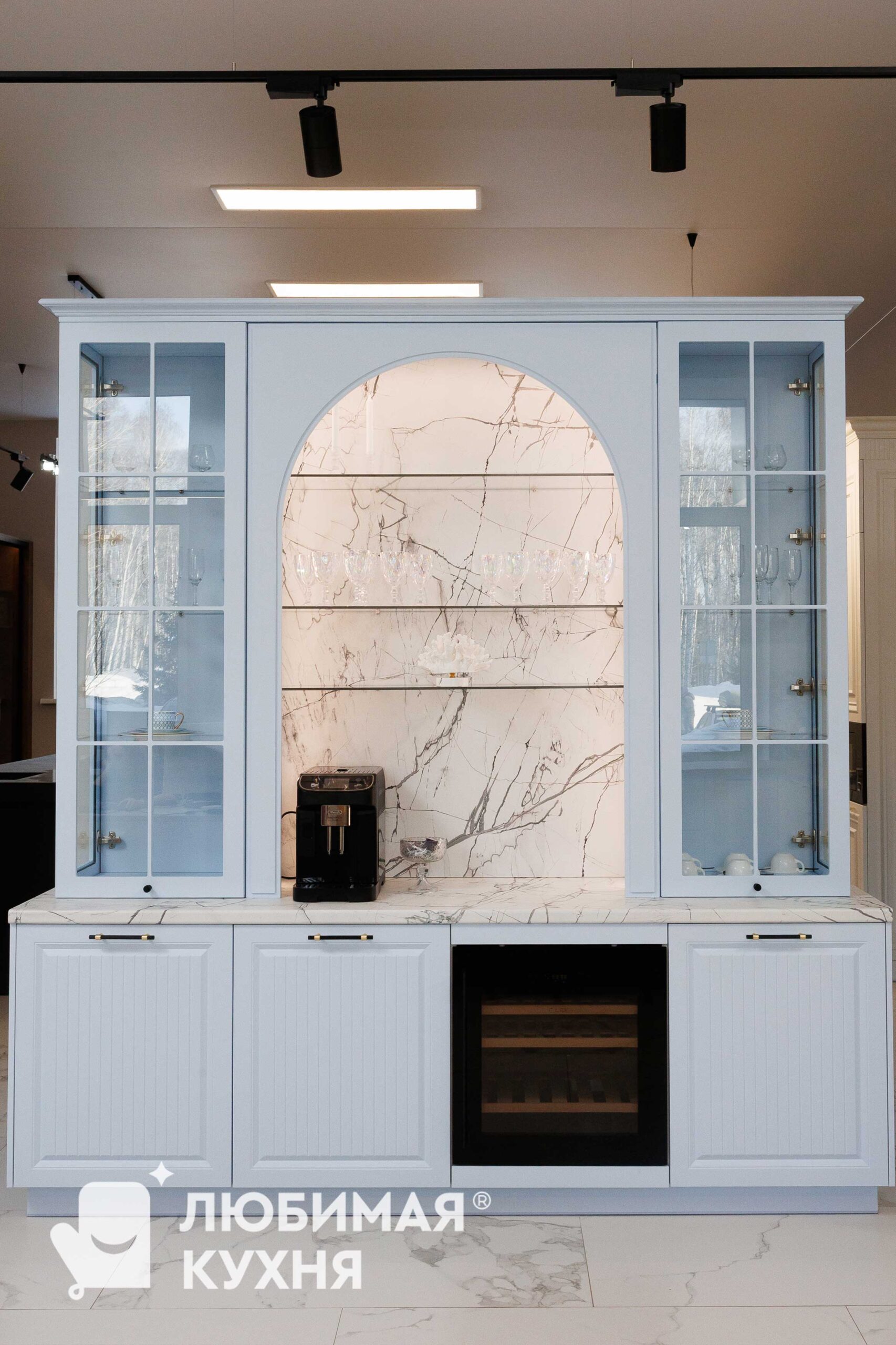Элегантная кухня в классическом стиле с фасадами нежно-голубого оттенка. Центральная композиция выделяется арка с мраморным фартуком, встроенной стеклянной полкой для бокалов и подсветкой. Симметричные витрины с решётчатыми фасадами по бокам создают ощущение лёгкости. Нижний ряд дополнен винным шкафом и фактурными филенчатыми дверцами с бронзовой фурнитурой. Столешница и напольная плитка из мрамора поддерживают монохромную гамму, а чёрные трековые светильники добавляют современный акцент.