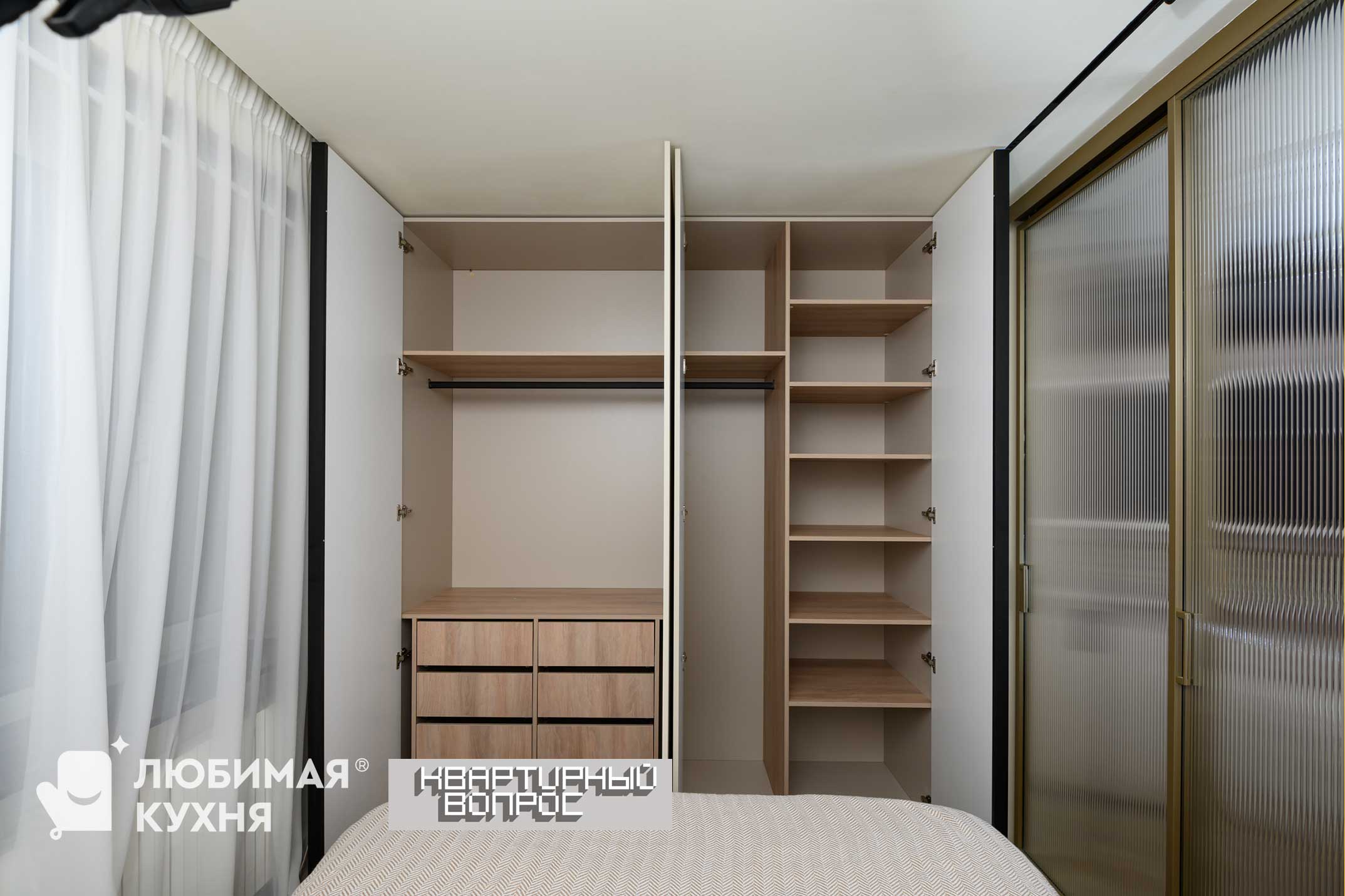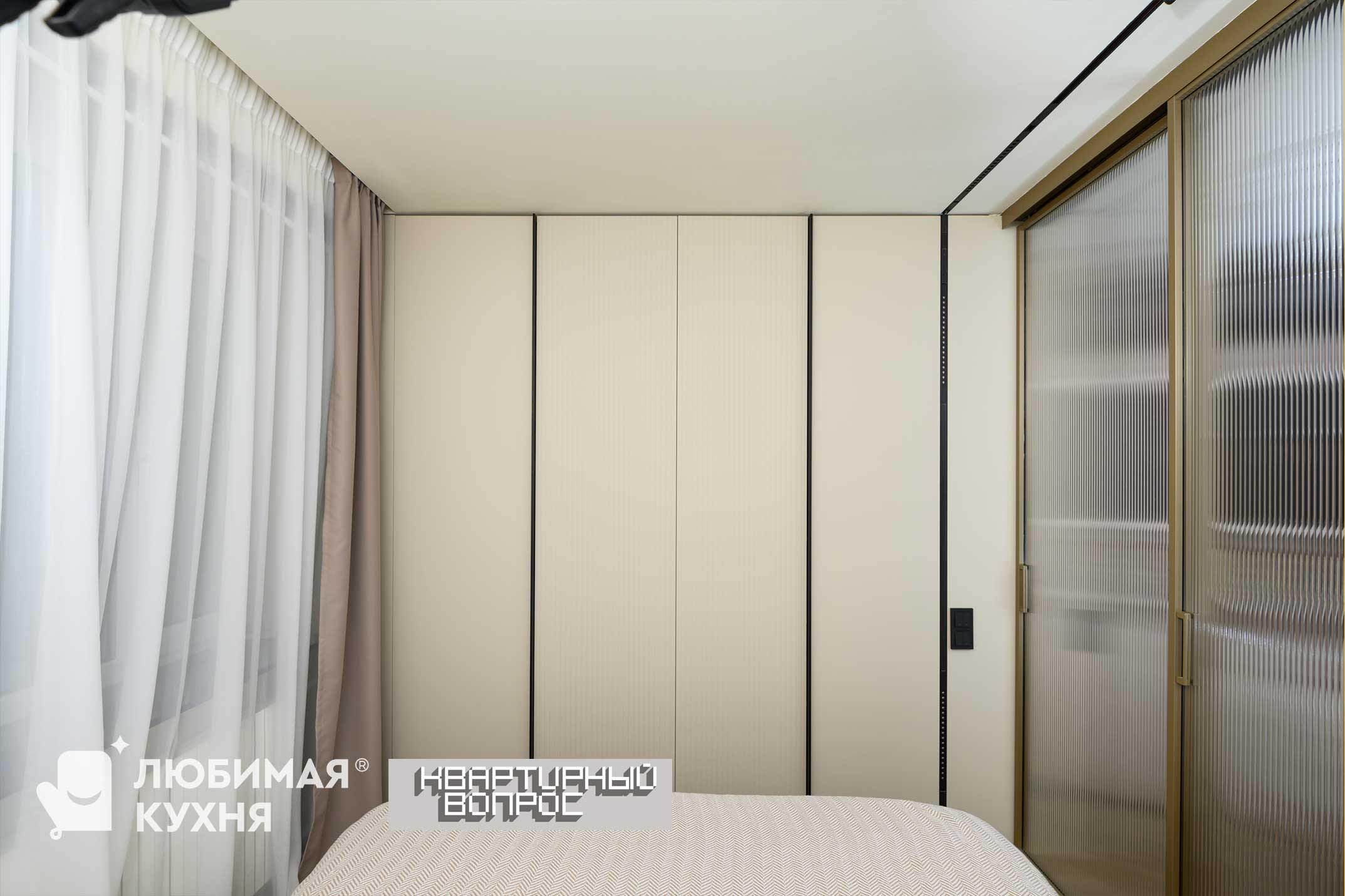 Масштабная переделка — затронула кухню, гостиную и коридор. В результате появилось единое пространство, в котором будет кухня станет удобнее и просторнее, а в гостиной – место для полноценной двуспальной кровати. Помогут нам в этом знание математики и архитектурное образование, немного магии и основательная работа со стенами и дверными проемами. А объединит комнату бежевый цвет, компанию которому составят мягкие полутона и контрастные акценты черного и белого цветов.