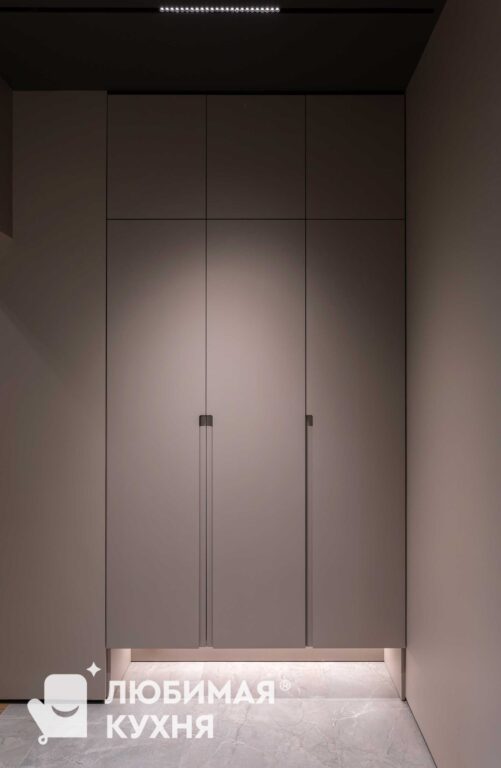 Прихожая выполнена в современном минималистичном дизайне и отлично впишется практически в любой интерьер. Графитовое зеркало во всю стену зрительно расширяет пространство, мягкая подсветка по периметру создаёт эффект парящего зеркала, а интегрированные ручки смотрятся очень стильно. Обратите внимание на подвесную консоль в цвет элементов декора шкафа. Выполнена под дерево в цвете «срез дуба темный». Консоль очень удобно использовать для хранения мелочей и элементов одежды. Шкаф из трех отделений и тумбой с зеркалом. В первом отделении располагается штанга для размещения длинных вещей и выкатная сетка для обуви. Во втором отделении сетки для обуви и ящики для хранения мелких вещей и аксессуаров. В третьем отделении так же располагается сетка для обуви. Подвесная тумба с ящиком из двух отделений.