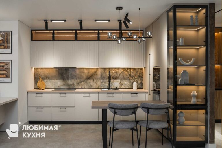 Кухни с витриной — это гарнитуры, в которых часть фасадов выполнена со стеклянными вставками. Витрины придают кухне лёгкость и утончённость, а также позволяют красиво выставить посуду, бокалы, элементы декора или сервизы.